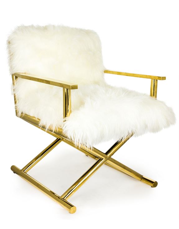 Yes Boss! This Hollywood inspired brass directors style chair with white Mongolian fur style seat is a lavish and luxurious chair with a retro feel. A quality sturdy piece with lasting strength allowing you to lean back and relax.
