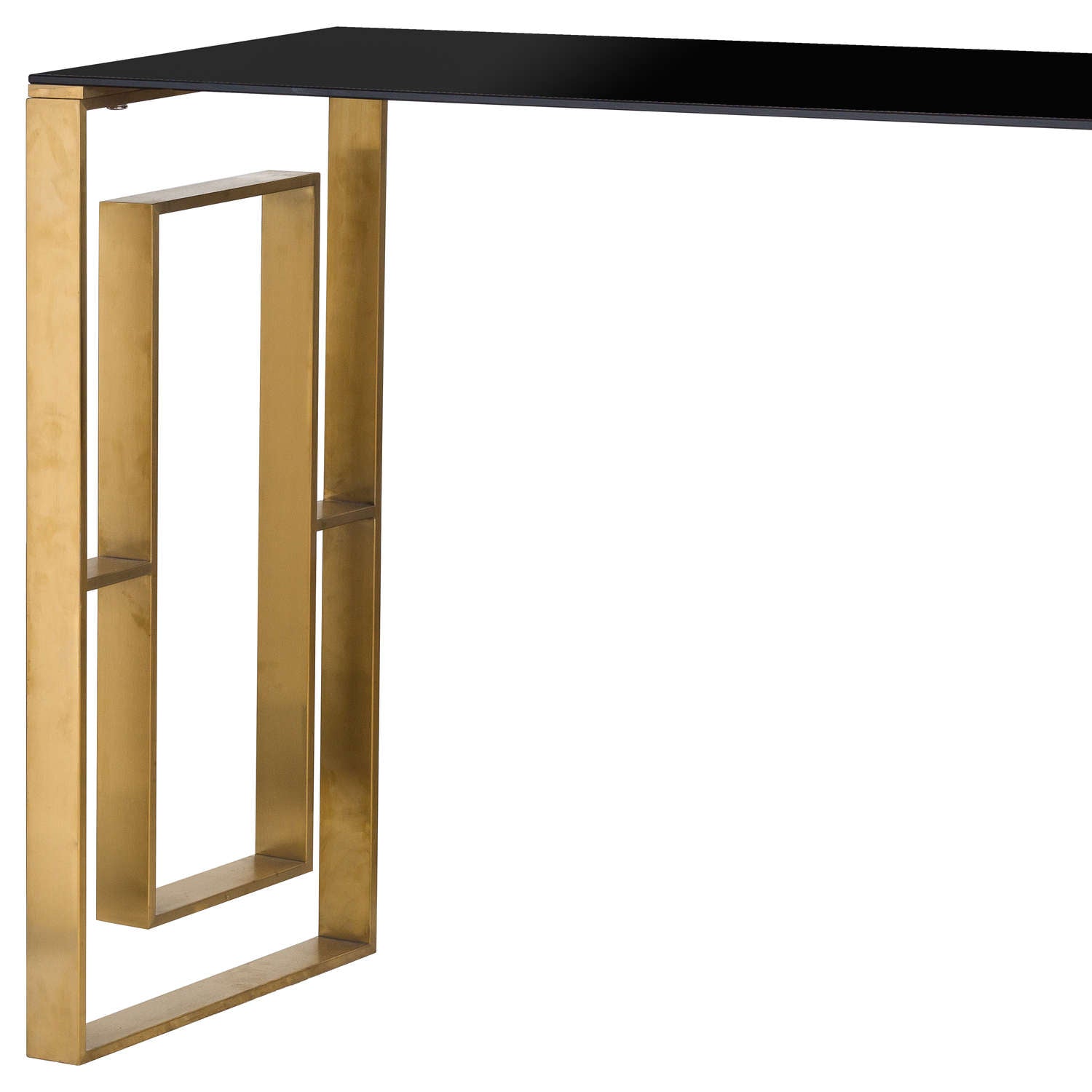 A luxurious combination of black glass and brass metal lend the Edwin collection a Gatsby-esque, Art Deco feel which conjures images of opulance and plenty. The Edwin Stainless Console Table's sleek, geometric design features ensure it feels modern, with just an echo of the golden age.